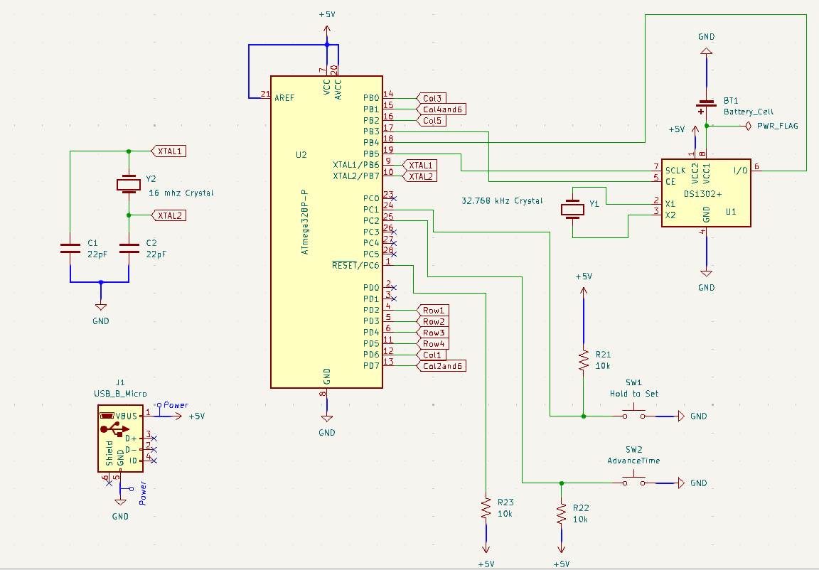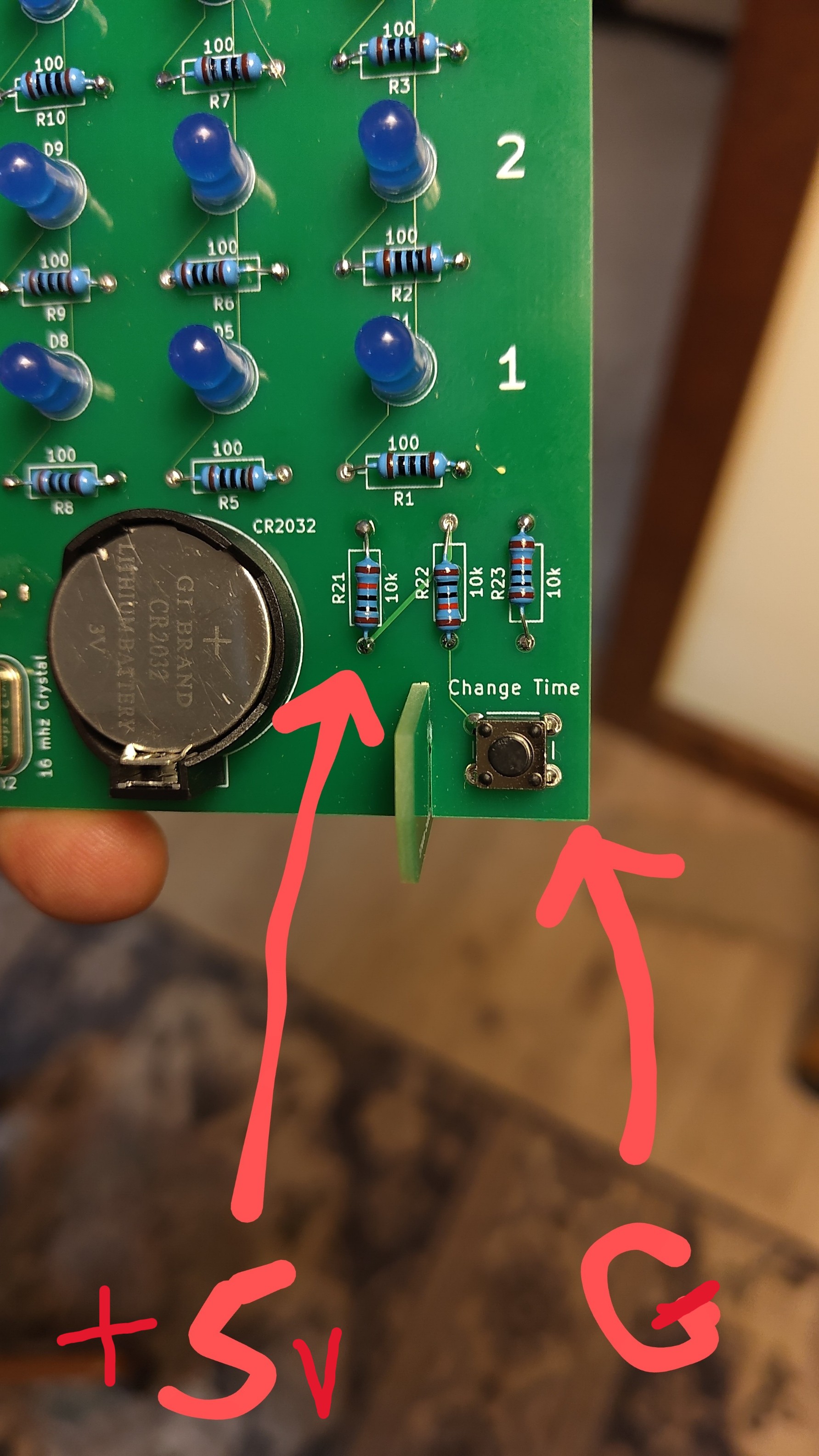 +5v and GND Test Points - Voltages can be tested from the bottom of R21 and the time change button.
